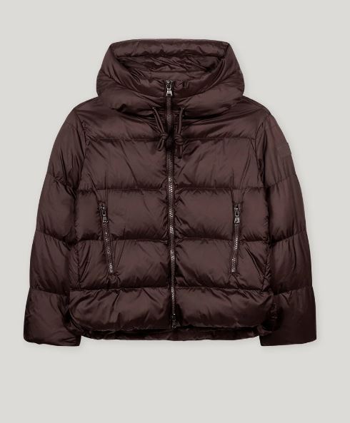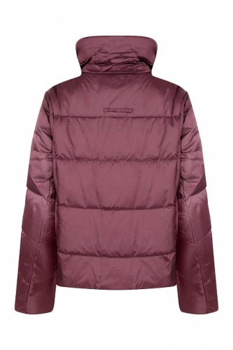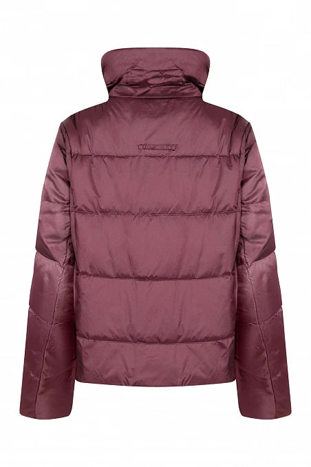 Женская бордовая куртка прямого кроя. Высокий воротник-стойка обеспечивает дополнительное тепло и уют. Регулярный узор горизонтальных стежков придает изделию аккуратный вид и объем. Прямые рукава доходят до запястий, обеспечивая свободу движений. Легкий блеск материала добавляет изысканности общему виду. Отличный выбор для создания стильного и функционального зимнего образа.