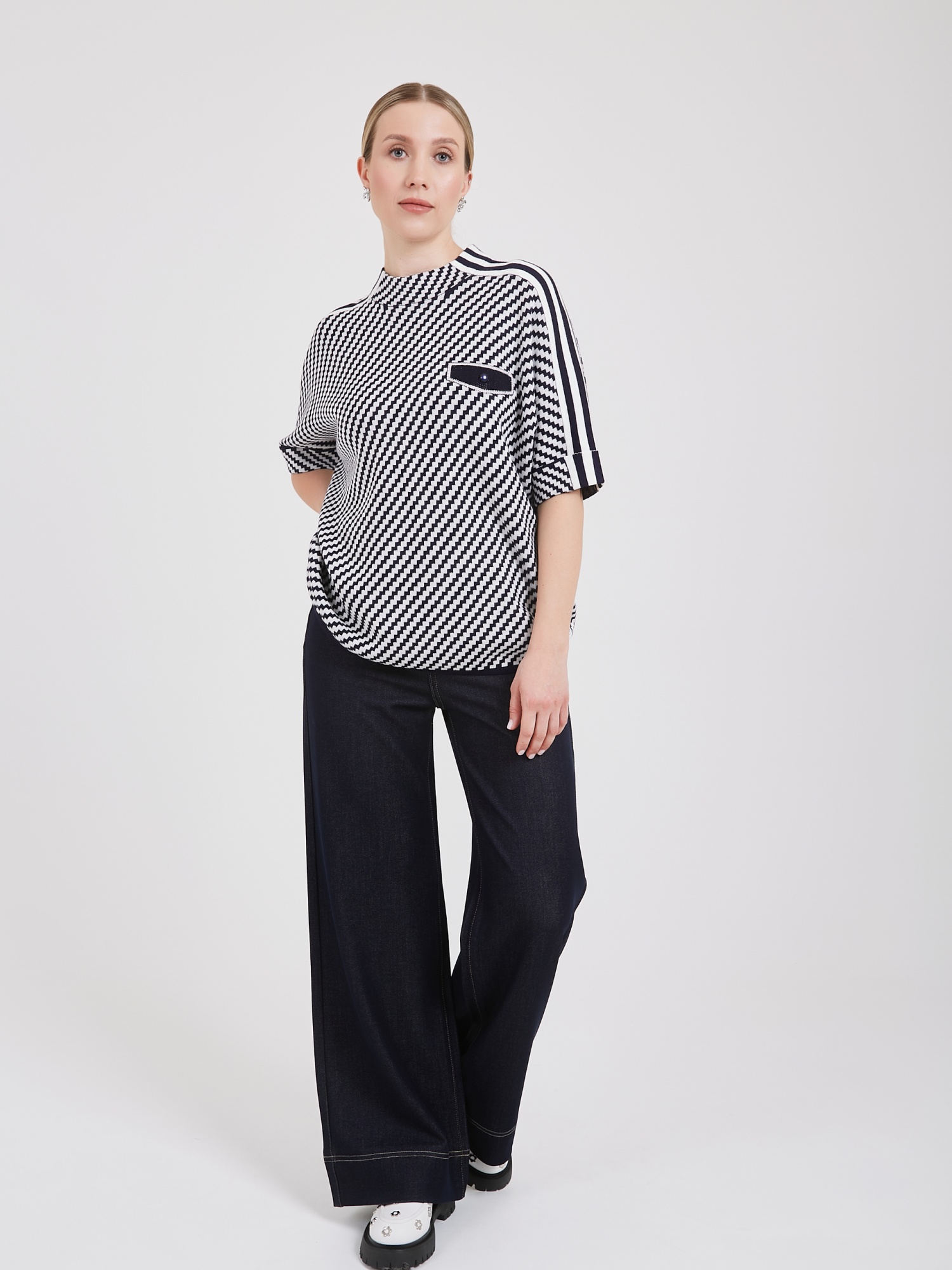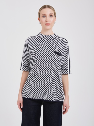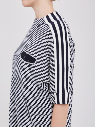 Женский джемпер с интересным шевронным узором из контрастирующих белых и темно-синих полос. Короткие рукава украшены белыми полосками, плавно спускающимися по плечам, создавая динамичный эффект. Небольшой нагрудный карман с оригинальной пуговицей добавляет элемент стиля и функциональности.